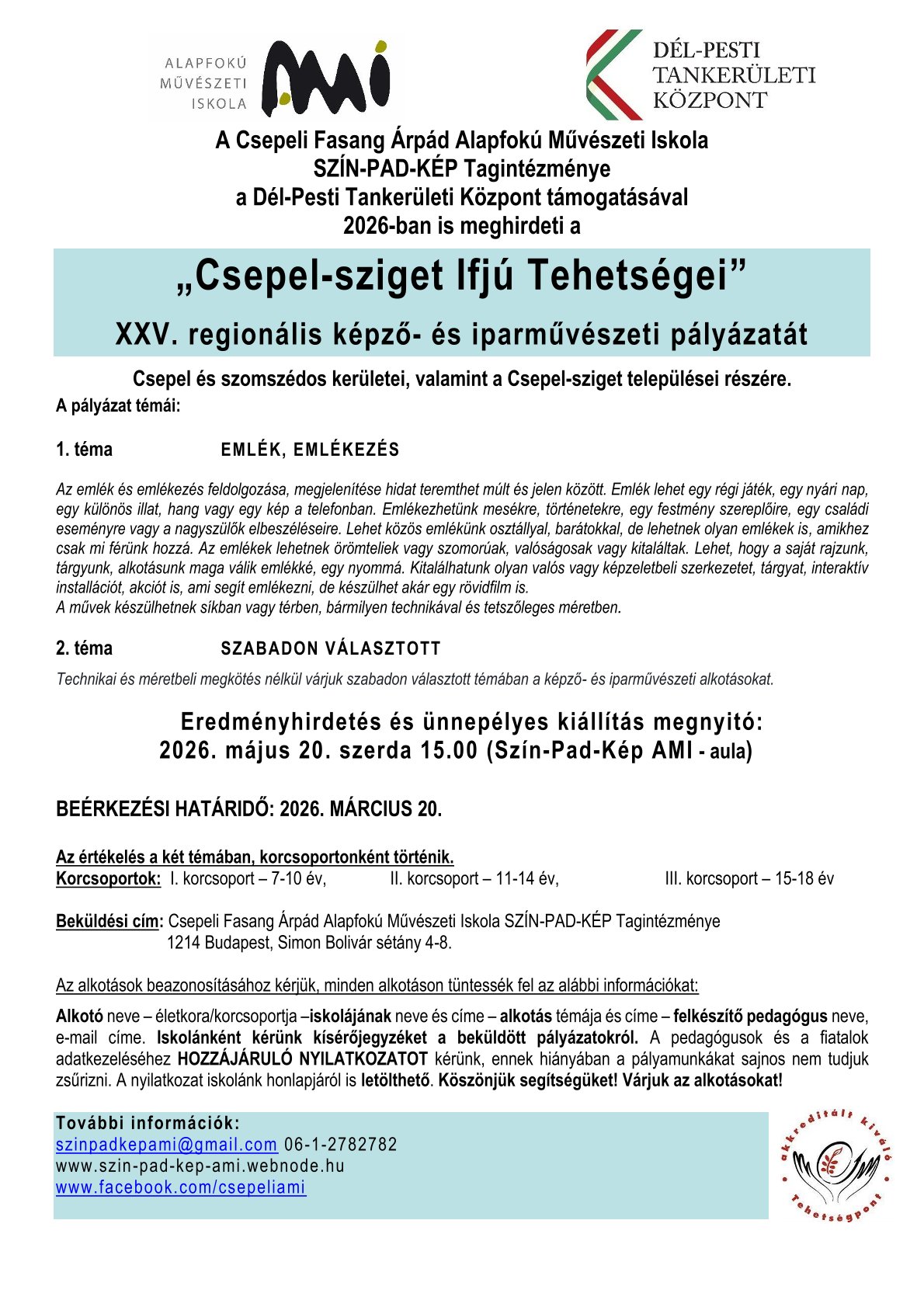 A Csepeli Fasang Árpád Alapfokú Művészeti Iskola SZÍN-PAD-KÉP Tagintézménye a Dél-Pesti Tankerületi Központ támogatásával 2026-ban is meghirdeti a Csepel-sziget Ifjú Tehetségei XXV. regionális képző-és iparművészeti pályázatát Csepel és szomszédos kerületei, valamint a Csepel-sziget települései részére.
